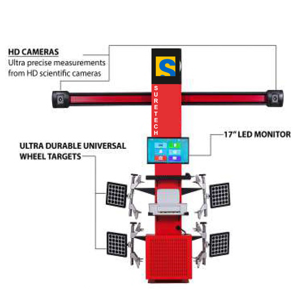 The universal clamp design securely fits wheels ranging from 12" to 24" rims, while high-definition cameras provide precise, real-time alignment readings and diagnostic data, enhanced by patented imaging technology for accurate measurements.